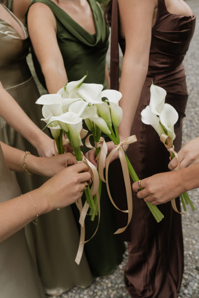 I want to touch on the details because they were thoughtful and intentional. Their color palette pulled straight from nature with warm neutrals, soft greens, and touches of burgundy for a little depth. The bridesmaids’ dresses weren’t matchy-matchy, which I loved—each one was a slightly different tone of sage, olive, taupe, or chocolate, and together they looked incredible in the forest.