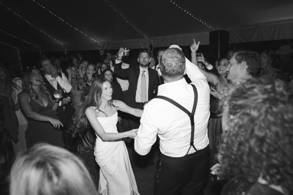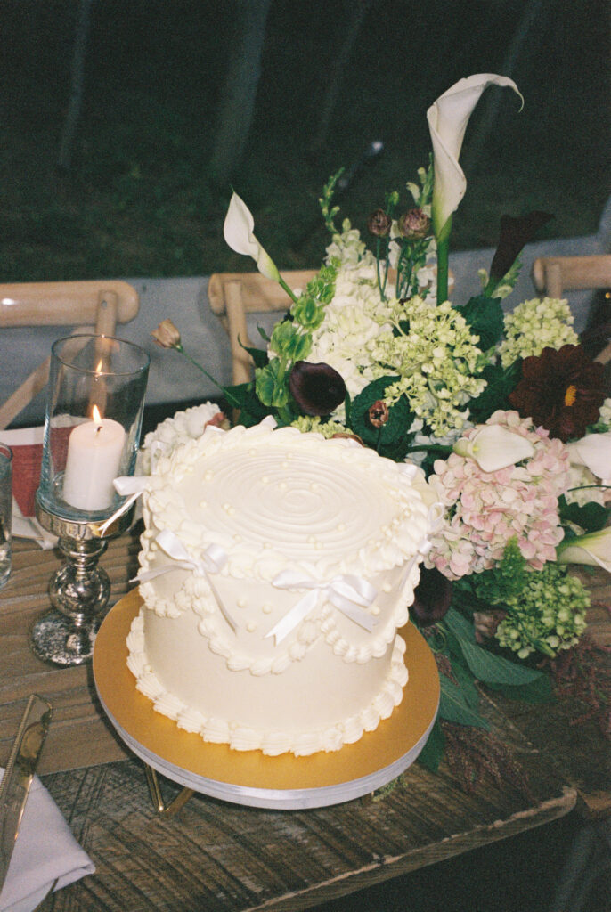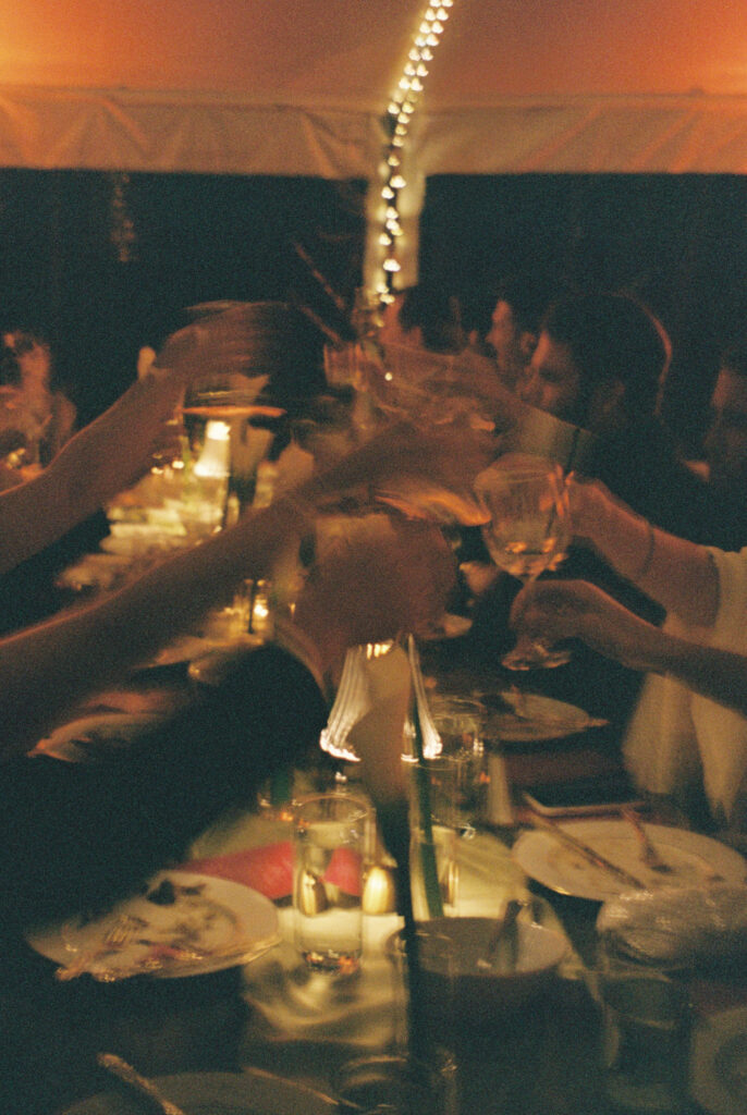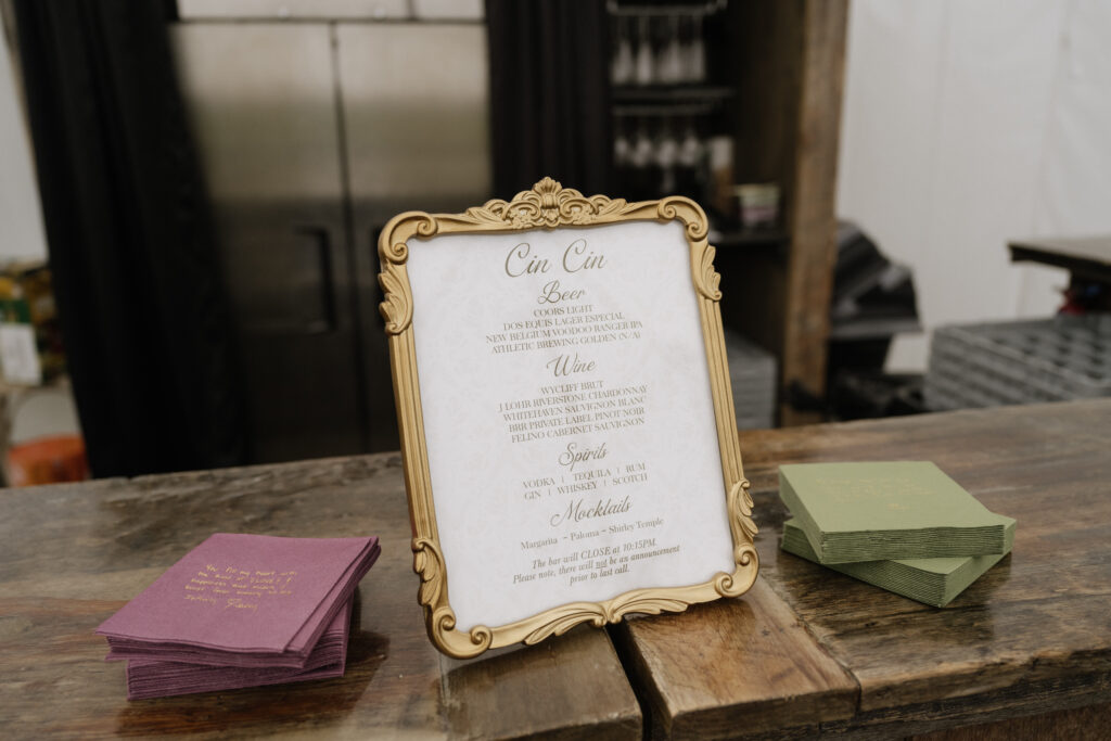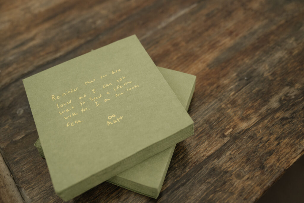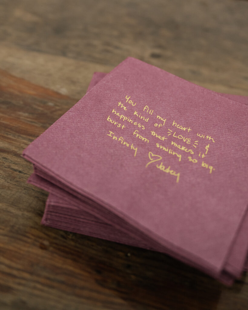 The reception setup inside the tent was such a cozy dream. Long wooden tables were draped with soft green and beige runners, lined with gold flatware, and dotted with candles that made everything feel intimate. Burgundy menus added a fun pop of color, and the florals tied it all together. One of my favorite details was the custom napkins printed with love notes they’d written to each other!